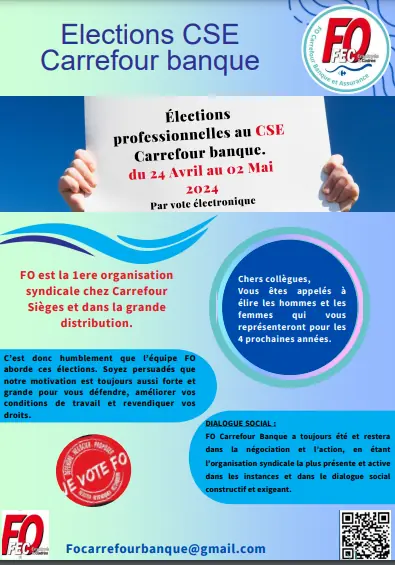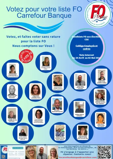 Votez pour FO Carrefour Banque, c'est voter pour une équipe dynamique, qui accompagne autant les cadres que les employés. Une équipe proche de vous et qui remonte vos problématiques auprès de la Direction.